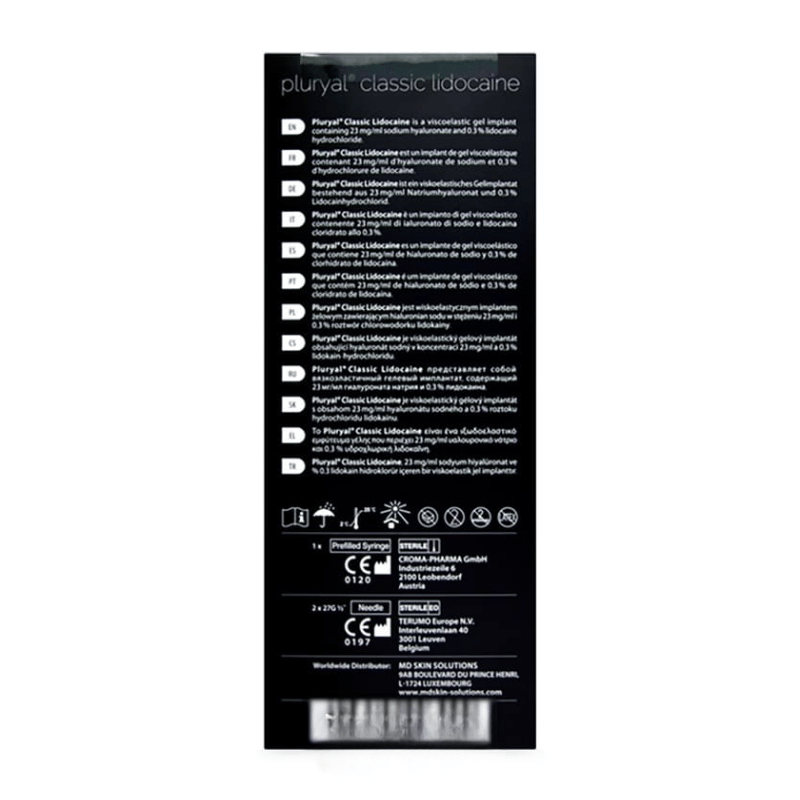 PluryalClassic Lidocaine is an innovative hyaluronic derma filler used to correct wrinkles, cutaneous fractures, and remodel lips in the mid-dermis. Use?Pluryal Classic Lidocaine?to smooth wrinkles and restore lost volume. The product contains?lidocaine, a powerful anaesthetic, for a more comfortable injection.